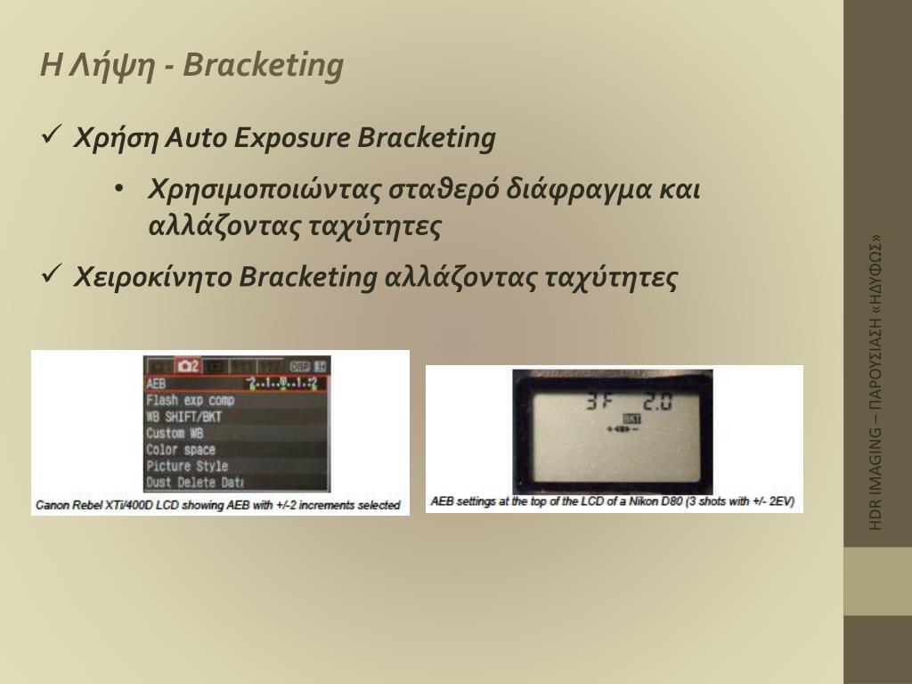 H Λήψη - Bracketing • Χρήση Auto Exposure Bracketing • Χρησιμοποιώντας σταθερό διάφραγμα και αλλάζοντας ταχύτητες • Χειροκίνητο Bracketing αλλάζοντας ταχύτητες HDR IMAGING – ΠΑΡΟΥΣΙΑΣΗ «ΗΔΥΦΩΣ»