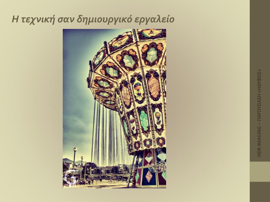 Η τεχνική σαν δημιουργικό εργαλείο HDR IMAGING – ΠΑΡΟΥΣΙΑΣΗ «ΗΔΥΦΩΣ» • Εκτός από την απόδοση μεγαλύτερου δυναμικού εύρους σε μια φωτογραφία, μπορούμε να χρησιμοποιήσουμε την τεχνική για να δημιουργήσουμε ενδιαφέροντα εφέ...