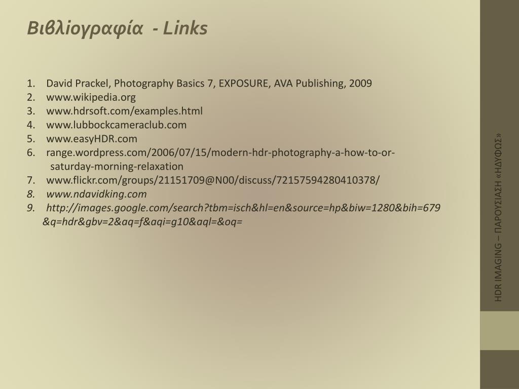 Βιβλiογραφία - Links • David Prackel, Photography Basics 7, EXPOSURE, AVA Publishing, 2009 • www.wikipedia.org • www.hdrsoft.com/examples.html • www.lubbockcameraclub.com • www.easyHDR.com • range.wordpress.com/2006/07/15/modern-hdr-photography-a-how-to-or- • saturday-morning-relaxation • www.flickr.com/groups/21151709@N00/discuss/72157594280410378/ • www.ndavidking.com • http://images.google.com/search?tbm=isch&hl=en&source=hp&biw=1280&bih=679 • &q=hdr&gbv=2&aq=f&aqi=g10&aql=&oq= HDR IMAGING – ΠΑΡΟΥΣΙΑΣΗ «ΗΔΥΦΩΣ»