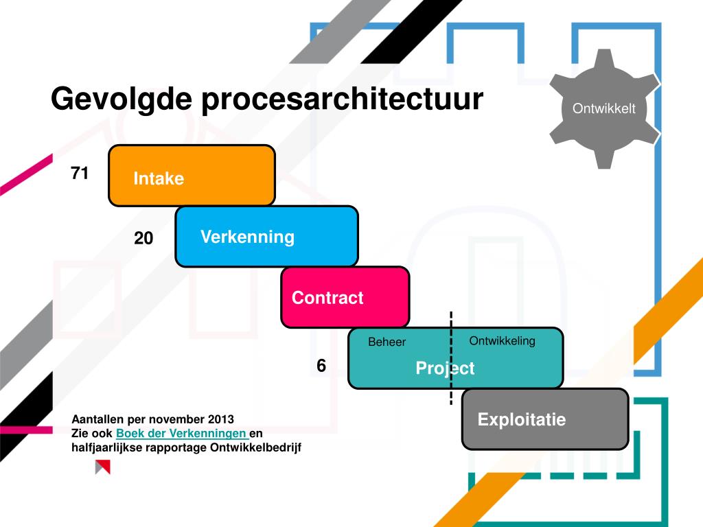 Gevolgde procesarchitectuur 71 Intake • Ontwikkelt Verkenning 20 Contract Ontwikkeling Beheer KVL 6 Project Exploitatie Aantallen per november 2013 Zie ook Boek der Verkenningen en halfjaarlijkse rapportage Ontwikkelbedrijf