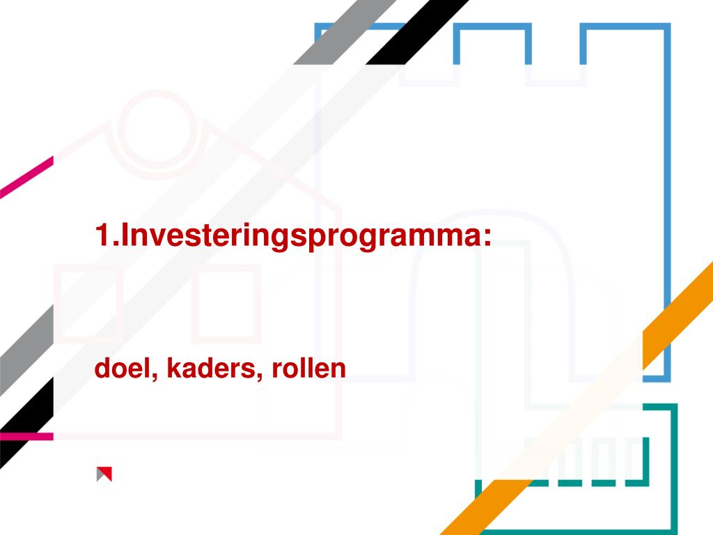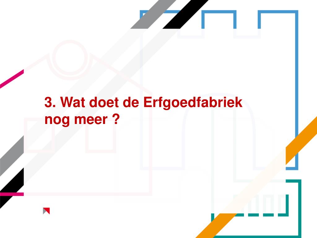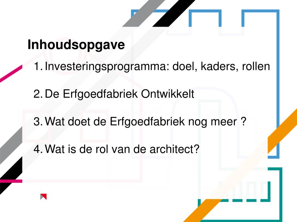Inhoudsopgave Investeringsprogramma: doel, kaders, rollen De Erfgoedfabriek Ontwikkelt Wat doet de Erfgoedfabriek nog meer ? Wat is de rol van de architect?