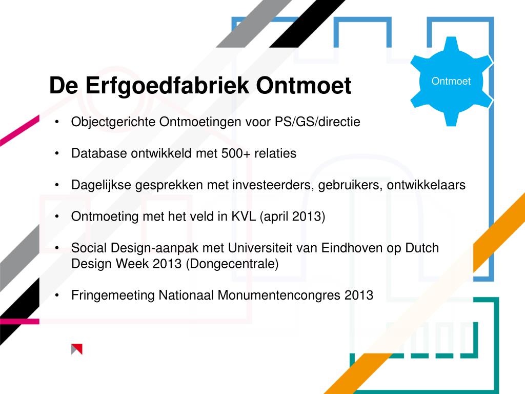 De Erfgoedfabriek Ontmoet • Objectgerichte Ontmoetingen voor PS/GS/directie • Database ontwikkeld met 500+ relaties • Dagelijkse gesprekken met investeerders, gebruikers, ontwikkelaars • Ontmoeting met het veld in KVL (april 2013) • Social Design-aanpak met Universiteit van Eindhoven op Dutch Design Week 2013 (Dongecentrale) • Fringemeeting Nationaal Monumentencongres 2013 • Ontmoet
