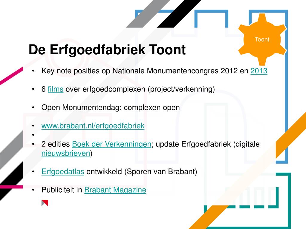 De Erfgoedfabriek Toont • Keynote posities op Nationale Monumentencongres 2012 en 2013 • 6 films over erfgoedcomplexen (project/verkenning) • Open Monumentendag: complexen open • www.brabant.nl/erfgoedfabriek • 2 edities Boek der Verkenningen; update Erfgoedfabriek (digitale nieuwsbrieven) • Erfgoedatlas ontwikkeld (Sporen van Brabant) • Publiciteit in Brabant Magazine • Toont