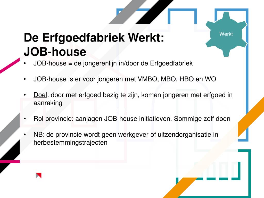 De Erfgoedfabriek Werkt: • JOB-house • JOB-house = de jongerenlijn in/door de Erfgoedfabriek • JOB-house is er voor jongeren met VMBO, MBO, HBO en WO • Doel: door met erfgoed bezig te zijn, komen jongeren met erfgoed in aanraking • Rol provincie: aanjagen JOB-house initiatieven. Sommige zelf doen • NB: de provincie wordt geen werkgever of uitzendorganisatie in herbestemmingstrajecten • Werkt Jongeren HBO