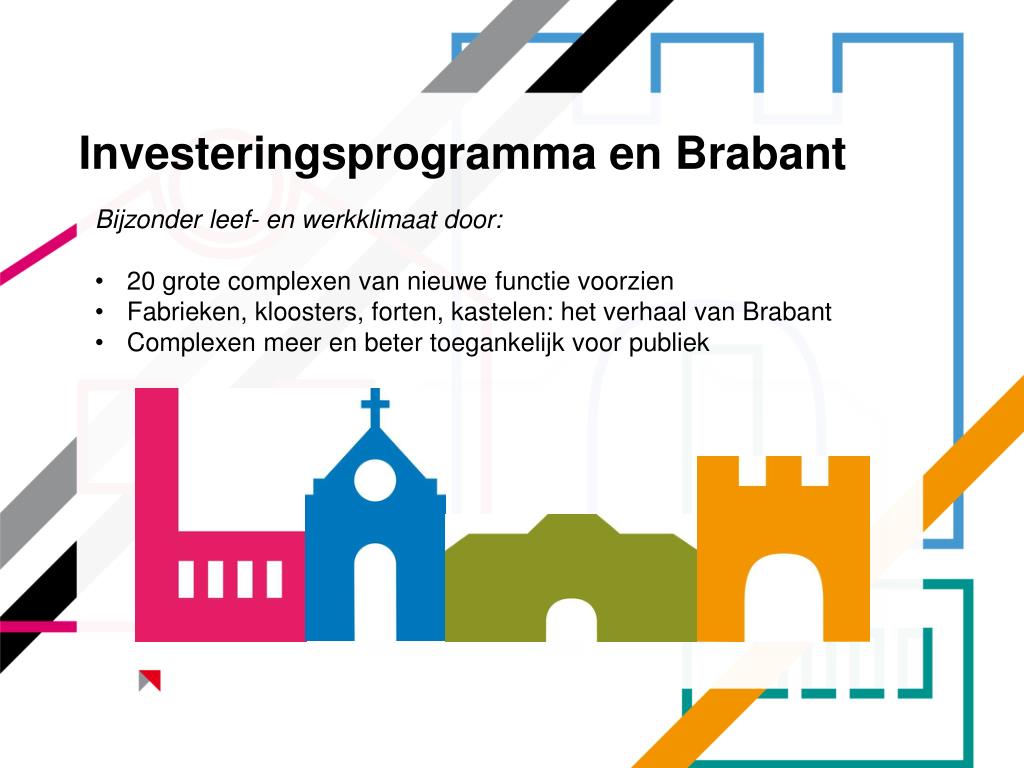 Investeringsprogramma en Brabant • Bijzonder leef- en werkklimaat door: • 20 grote complexen van nieuwe functie voorzien • Fabrieken, kloosters, forten, kastelen: het verhaal van Brabant • Complexen meer en beter toegankelijk voor publiek