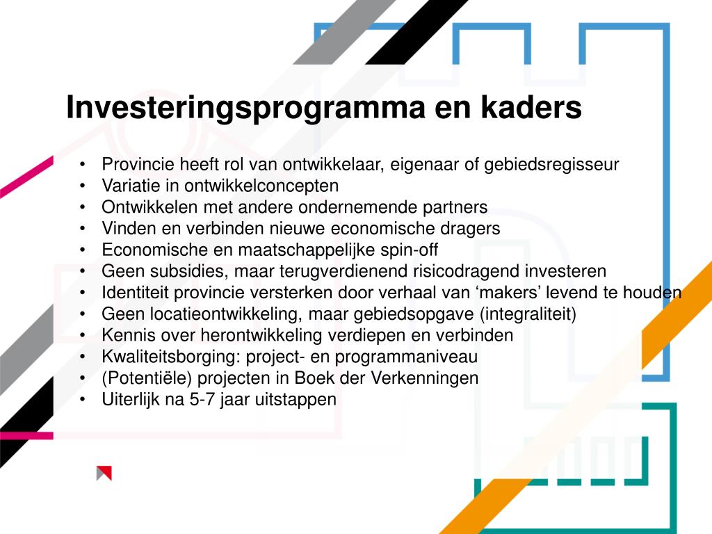 Investeringsprogramma en kaders • Provincie heeft rol van ontwikkelaar, eigenaar of gebiedsregisseur • Variatie in ontwikkelconcepten • Ontwikkelen met andere ondernemende partners • Vinden en verbinden nieuwe economische dragers • Economische en maatschappelijke spin-off • Geen subsidies, maar terugverdienend risicodragend investeren • Identiteit provincie versterken door verhaal van ‘makers’ levend te houden • Geen locatieontwikkeling, maar gebiedsopgave (integraliteit) • Kennis over herontwikkeling verdiepen en verbinden • Kwaliteitsborging: project- en programmaniveau • (Potentiële) projecten in Boek der Verkenningen • Uiterlijk na 5-7 jaar uitstappen