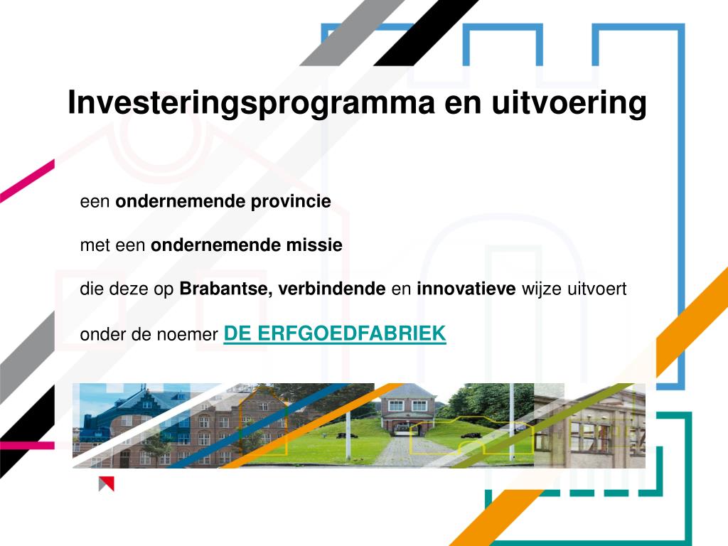 Investeringsprogramma en uitvoering een ondernemende provincie met een ondernemende missie die deze op Brabantse, verbindende en innovatieve wijze uitvoert onder de noemer DE ERFGOEDFABRIEK