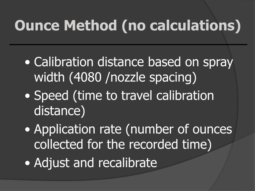 Ounce Method (no calculations) • Calibration distance based on spray width (4080 /nozzle spacing) • Speed (time to travel calibration distance) • Application rate (number of ounces collected for the recorded time) • Adjust and recalibrate