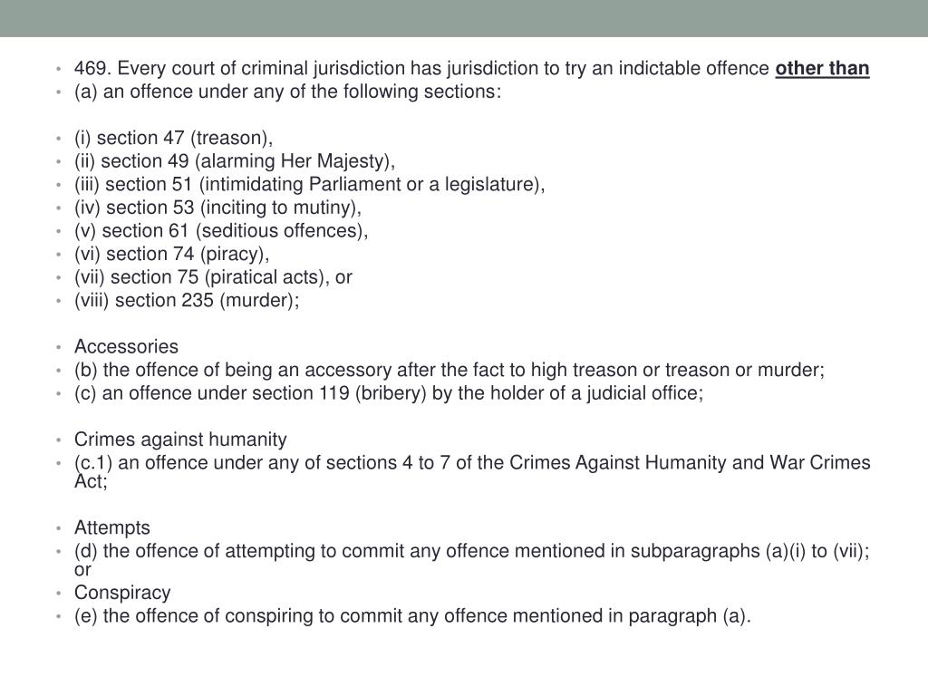 469. Every court of criminal jurisdiction has jurisdiction to try an indictable offence other than • (a) an offence under any of the following sections: • (i) section 47 (treason), • (ii) section 49 (alarming Her Majesty), • (iii) section 51 (intimidating Parliament or a legislature), • (iv) section 53 (inciting to mutiny), • (v) section 61 (seditious offences), • (vi) section 74 (piracy), • (vii) section 75 (piratical acts), or • (viii) section 235 (murder); • Accessories • (b) the offence of being an accessory after the fact to high treason or treason or murder; • (c) an offence under section 119 (bribery) by the holder of a judicial office; • Crimes against humanity • (c.1) an offence under any of sections 4 to 7 of the Crimes Against Humanity and War Crimes Act; • Attempts • (d) the offence of attempting to commit any offence mentioned in subparagraphs (a)(i) to (vii); or • Conspiracy • (e) the offence of conspiring to commit any offence mentioned in paragraph (a).