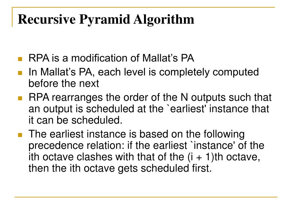Recursive Pyramid Algorithm • RPA is a modification of Mallat’s PA • In Mallat’s PA, each level is completely computed before the next • RPA rearranges the order of the N outputs such that an output is scheduled at the `earliest' instance that it can be scheduled. • The earliest instance is based on the following precedence relation: if the earliest `instance' of the ith octave clashes with that of the (i + 1)th octave, then the ith octave gets scheduled first.
