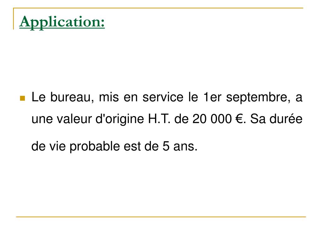 Application: • Le bureau, mis en service le 1er septembre, a une valeur d'origine H.T. de 20 000 €. Sa durée de vie probable est de 5 ans.