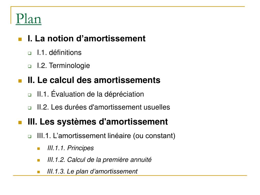 Plan • I. La notion d’amortissement • I.1. définitions • I.2. Terminologie • II. Le calcul des amortissements • II.1. Évaluation de la dépréciation • II.2. Les durées d'amortissement usuelles • III. Les systèmes d'amortissement • III.1. L’amortissement linéaire (ou constant) • III.1.1. Principes • III.1.2. Calcul de la première annuité • III.1.3. Le plan d’amortissement
