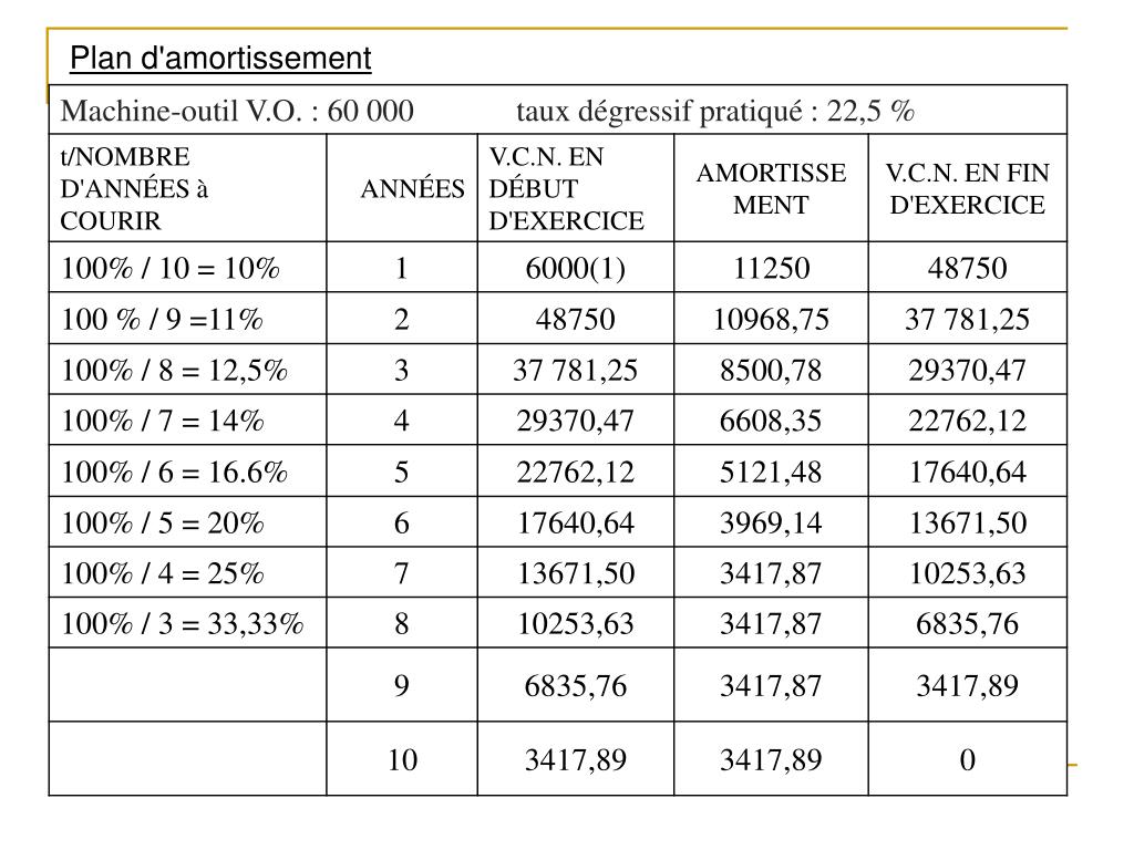 exemple : • Soit un matériel qui a pour valeur d'origine 100 000 € H.T. • Le taux d'amortissement retenu est de 40 %. • Nous aurons alors : • a1 = 100 000 x 0,4 = 40 000 => V.C.N.1 = 100 000 - 40 000 = 60 000 • a2 = 60 000 x 0,4 = 24 000 => V.C.N.2 = 60 000 - 24 000 = 36 000 • a3 = 36 000 x 0,4 = 14 400 => V.C.N.3 = 36 000 - 14 400 = 21 600 ... etc. • Les amortissements et les valeurs comptables nettes suivent une progression géométrique décroissante