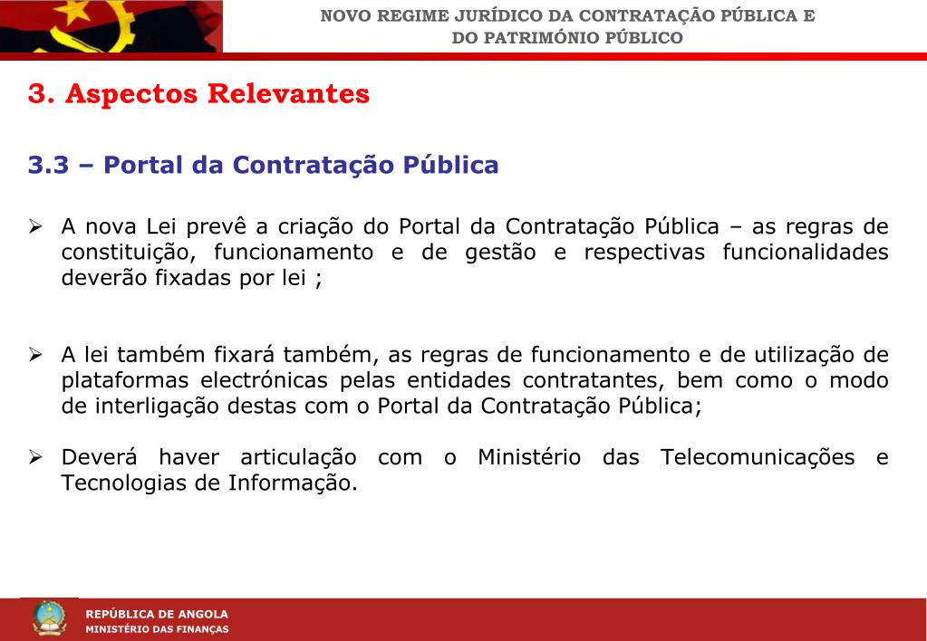 NOVO REGIME JURÍDICO DA CONTRATAÇÃO PÚBLICA E DO PATRIMÓNIO PÚBLICO 3. Aspectos Relevantes 3.3 – Portal da Contratação Pública A nova Lei prevê a criação do Portal da Contratação Pública – as regras de constituição, funcionamento e de gestão e respectivas funcionalidades deverão fixadas por lei ; A lei também fixará também, as regras de funcionamento e de utilização de plataformas electrónicas pelas entidades contratantes, bem como o modo de interligação destas com o Portal da Contratação Pública; Deverá haver articulação com o Ministério das Telecomunicações e Tecnologias de Informação.
