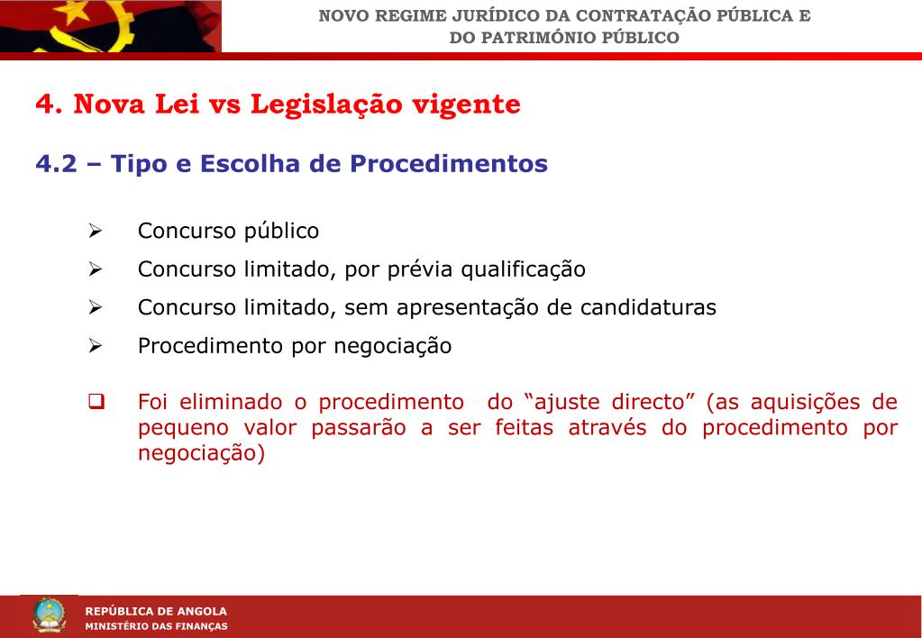 NOVO REGIME JURÍDICO DA CONTRATAÇÃO PÚBLICA E DO PATRIMÓNIO PÚBLICO 4. Nova Lei vs Legislação vigente 4.2 – Tipo e Escolha de Procedimentos • Concurso público • Concurso limitado, por prévia qualificação • Concurso limitado, sem apresentação de candidaturas • Procedimento por negociação • Foi eliminado o procedimento do “ajuste directo” (as aquisições de pequeno valor passarão a ser feitas através do procedimento por negociação)