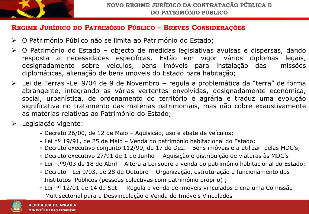 NOVO REGIME JURÍDICO DA CONTRATAÇÃO PÚBLICA E DO PATRIMÓNIO PÚBLICO Regime Jurídico do Património Público – Breves Considerações O Património Público não se limita ao Património do Estado; O Património do Estado – objecto de medidas legislativas avulsas e dispersas, dando resposta a necessidades específicas. Estão em vigor vários diplomas legais, designadamente sobre veículos, bens imóveis para instalação das missões diplomáticas, alienação de bens imóveis do Estado para habitação; Lei de Terras -Lei 9/04 de 9 de Novembro – regula a problemática da “terra” de forma abrangente, integrando as várias vertentes envolvidas, designadamente económica, social, urbanística, de ordenamento do território e agrária e traduz uma evolução significativa no tratamento das matérias patrimoniais, mas não cobre exaustivamente as matérias relativas ao Património do Estado; Legislação vigente: - Decreto 26/00, de 12 de Maio – Aquisição, uso e abate de veículos; - Lei nº 19/91, de 25 de Maio – Venda do património habitacional do Estado; - Decreto executivo conjunto 112/99, de 17 de Dez. - Bens imóveis e a utilizar pelas MDC’s; - Decreto executivo 27/91 de 1 de Junho - Aquisição e distribuição de viaturas às MDC’s - Lei n.º9/03 de 18 de Abril – Altera a Lei sobre a venda do património habitacional do Estado; - Decreto -Lei 9/03, de 28 de Outubro – Organização, estruturação e funcionamento dos Institutos Públicos (pessoas colectivas com património próprio) ; - Lei nº 12/01 de 14 de Set. – Regula a venda de imóveis vinculados e cria uma Comissão Multisectorial para a Desvinculação e Venda de Imóveis Vinculados