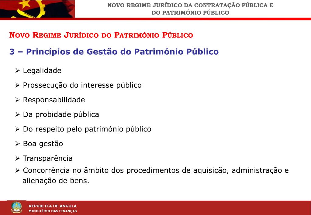 NOVO REGIME JURÍDICO DA CONTRATAÇÃO PÚBLICA E DO PATRIMÓNIO PÚBLICO Novo Regime Jurídico do Património Público – Lei Aprovada pela Assembleia Nacional 1 – Objecto e Âmbito Estabelece as bases gerais e o regime jurídico do património que integra o domínio público de Estado e das autarquias locais, bem como o regime jurídico do controlo da gestão do património que integra o domínio privado do Estado, das autarquias locais e do património público dos institutos públicos e de outras pessoas colectivas públicas pertencentes ao sector público administrativo; Estabelece também um dever especial às entidades do sector Público empresarial, empresas públicas e sociedades de capitais exclusiva ou maioritariamente públicos, de informação sobre o respectivo património próprio; Não prejudica os regimes estabelecidos na Lei de Terras ou do Património Cultural, sendo subsidiariamente aplicável, com as devidas adaptações aos patrimónios especiais.