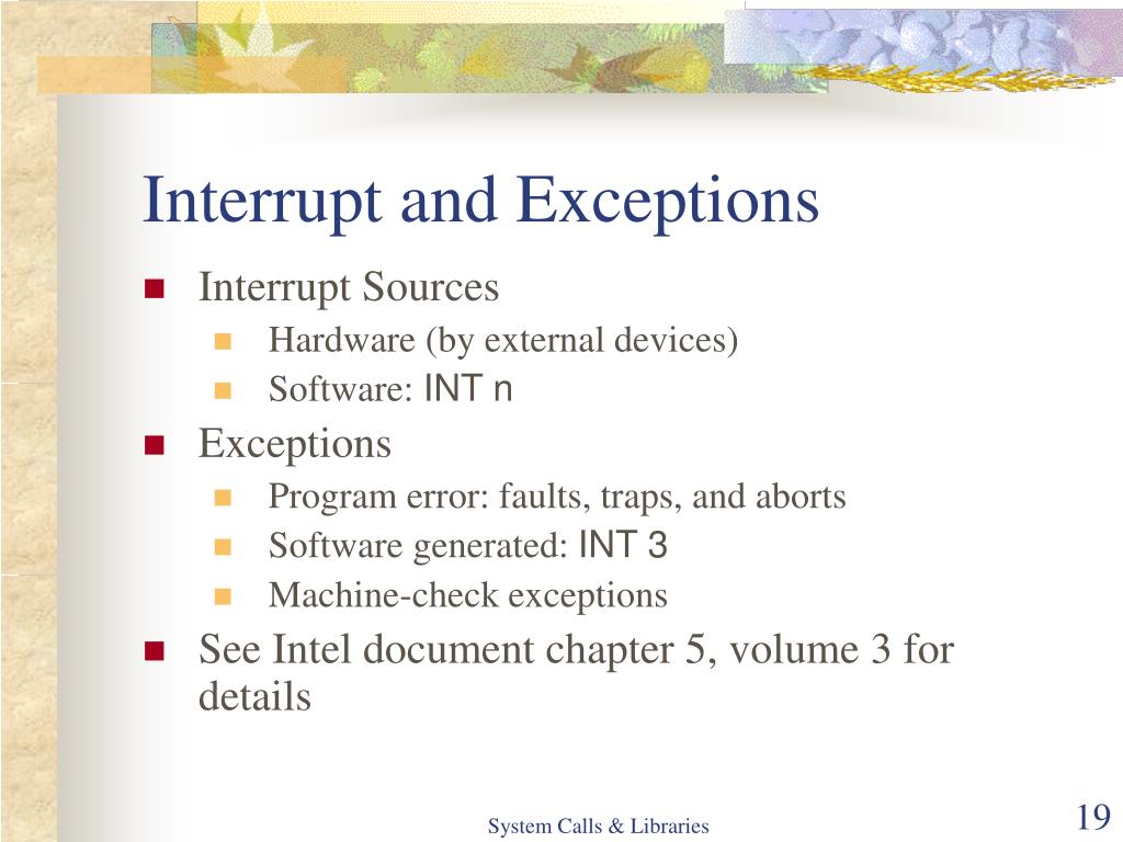 Interrupt and Exceptions • Interrupt Sources • Hardware (by external devices) • Software: INTn • Exceptions • Program error: faults, traps, and aborts • Software generated: INT 3 • Machine-check exceptions • See Intel document chapter 5, volume 3 for details System Calls & Libraries