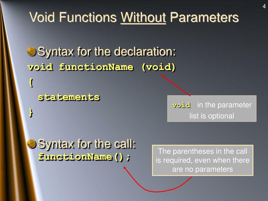 Void Functions Without Parameters voidin the parameter list is optional The parentheses in the call is required, even when there are no parameters • Syntax for the declaration: void functionName (void) { statements } • Syntax for the call:functionName();