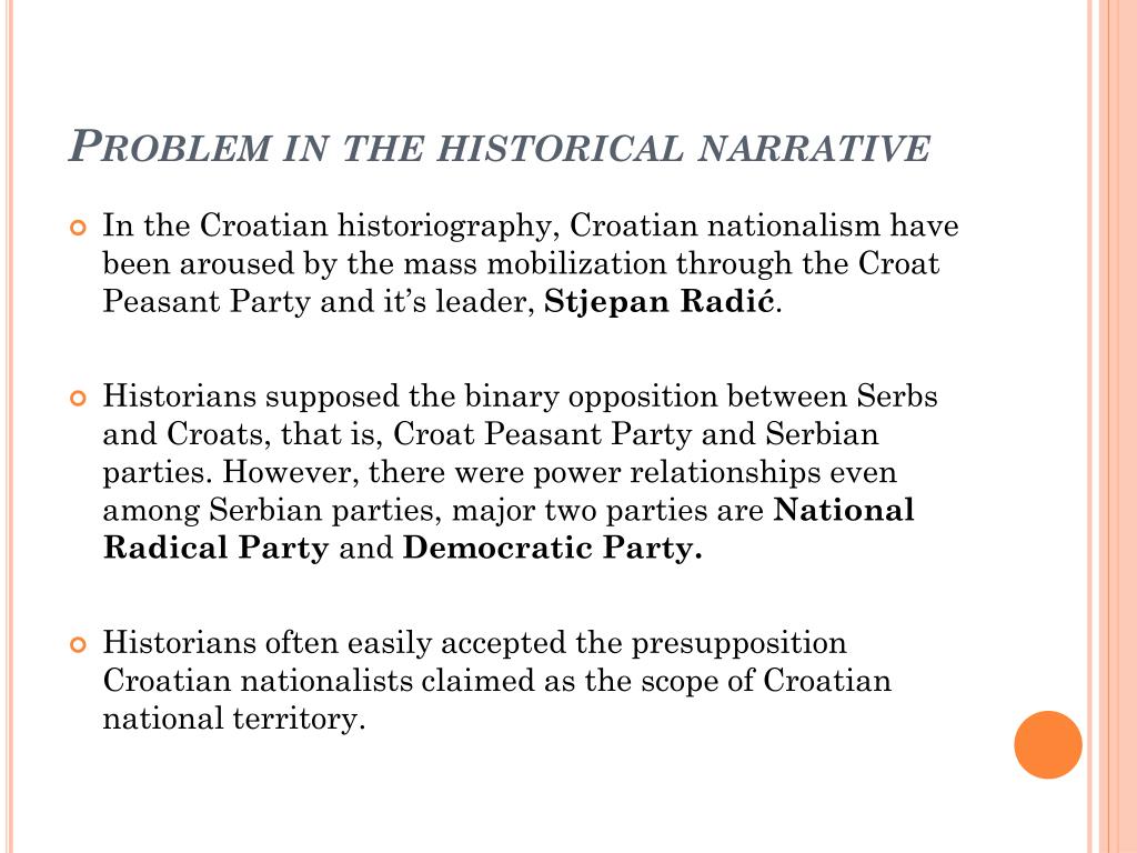 Problem in the historical narrative • In the Croatian historiography, Croatian nationalism have been aroused by the mass mobilization through the Croat Peasant Party and it’s leader, StjepanRadić. • Historians supposed the binary opposition between Serbs and Croats, that is, Croat Peasant Party and Serbian parties. However, there were power relationships even among Serbian parties, major two parties are National Radical Party and Democratic Party. • Historians often easily accepted the presupposition Croatian nationalists claimed as the scope of Croatian national territory.
