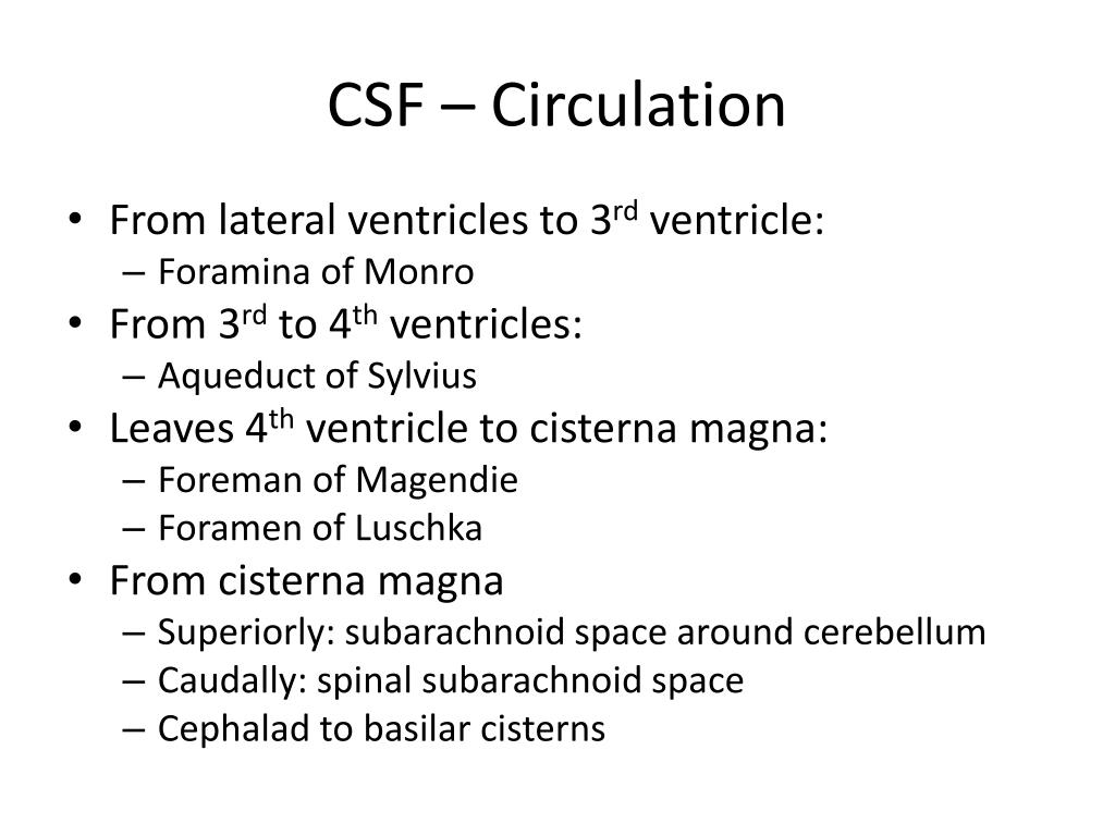 CSF – Circulation • From lateral ventricles to 3rd ventricle: • Foramina of Monro • From 3rd to 4th ventricles: • Aqueduct of Sylvius • Leaves 4th ventricle to cisterna magna: • Foreman of Magendie • Foramen of Luschka • From cisterna magna • Superiorly: subarachnoid space around cerebellum • Caudally: spinal subarachnoid space • Cephalad to basilar cisterns