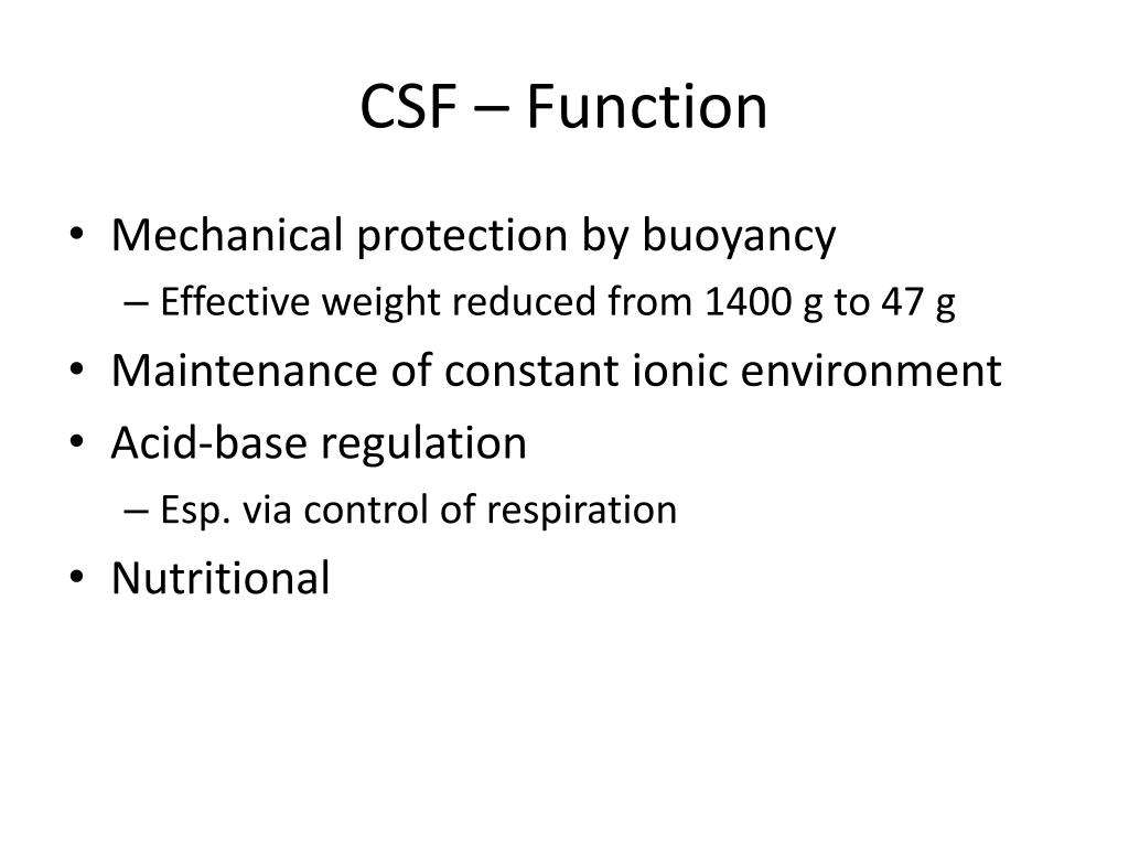 CSF – Function • Mechanical protection by buoyancy • Effective weight reduced from 1400 g to 47 g • Maintenance of constant ionic environment • Acid-base regulation • Esp. via control of respiration • Nutritional