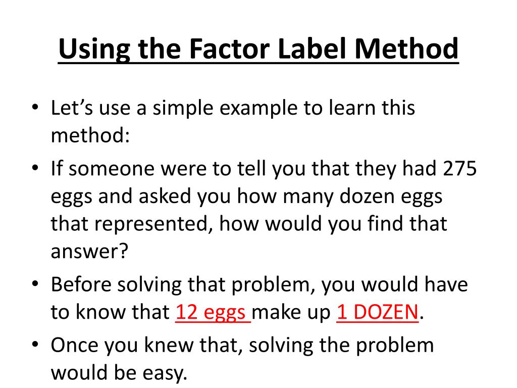 Using the Factor Label Method • Let’s use a simple example to learn this method: • If someone were to tell you that they had 275 eggs and asked you how many dozen eggs that represented, how would you find that answer? • Before solving that problem, you would have to know that 12 eggs make up 1 DOZEN. • Once you knew that, solving the problem would be easy.