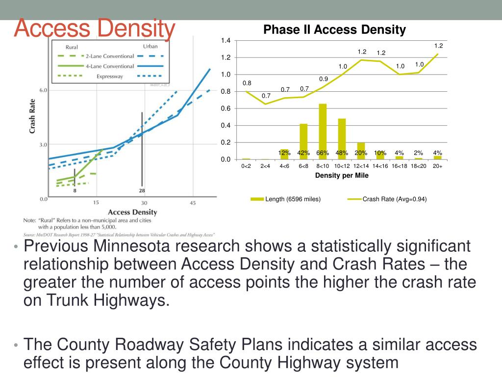 Access Density • Previous Minnesota research shows a statistically significant relationship between Access Density and Crash Rates – the greater the number of access points the higher the crash rate on Trunk Highways. • The County Roadway Safety Plans indicates a similar access effect is present along the County Highway system