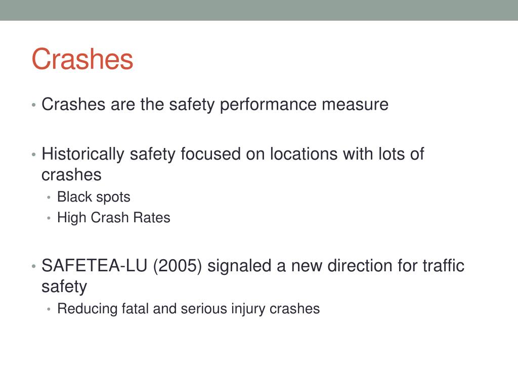 Crashes • Crashes are the safety performance measure • Historically safety focused on locations with lots of crashes • Black spots • High Crash Rates • SAFETEA-LU (2005) signaled a new direction for traffic safety • Reducing fatal and serious injury crashes