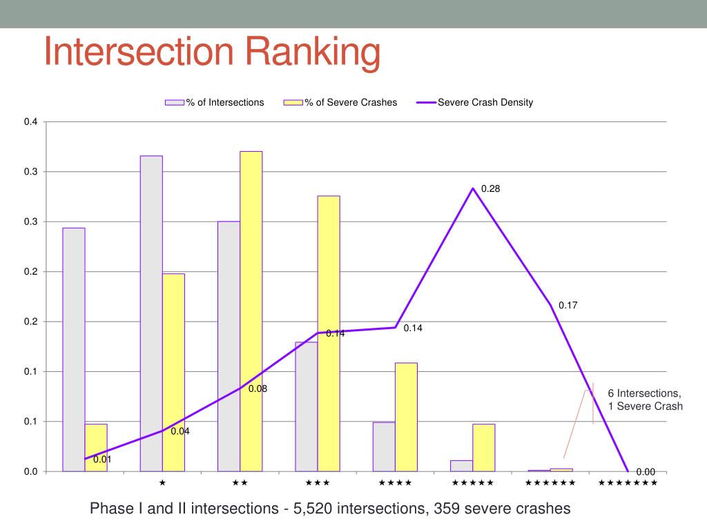 Intersection Ranking Phase I and II intersections - 5,520 intersections, 359 severe crashes 6 Intersections, 1 Severe Crash