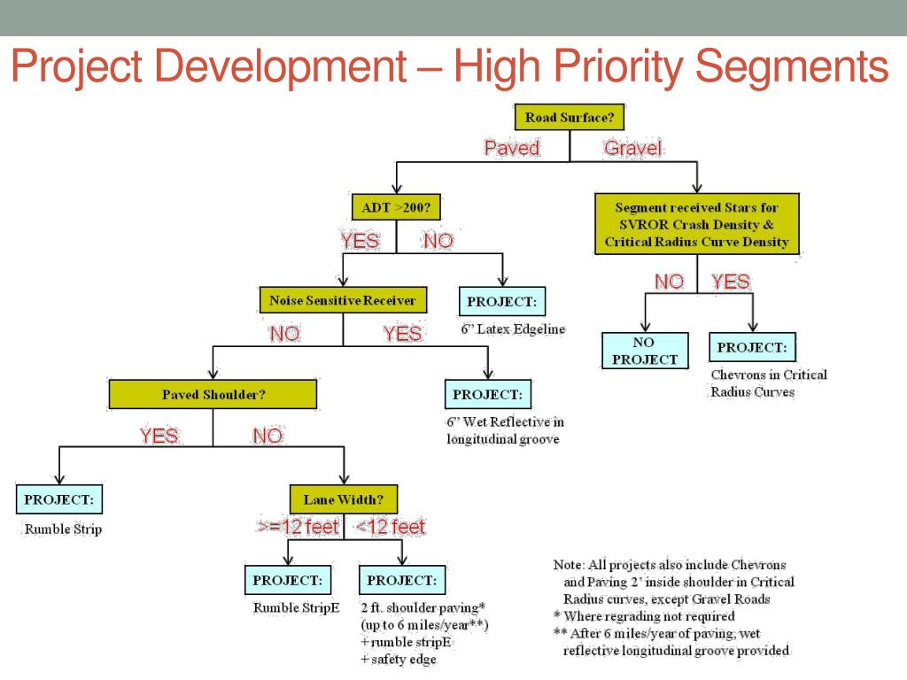 Rural Paved Segments • 47 counties in ATP 3, 4, 6 & 8 • 13,813 rural paved miles • Rural Road Departure Crashes • 21,611 total, 1,464 severe, 637 Severe RD • Average Density of Sev RD Crashes= 0.009 crashes/mi/year • Risk Rating Criteria • Density of Road Departure Crashes • Traffic Volume • Curve (Critical Radius) Density • Access Density • Edge Risk Assessment