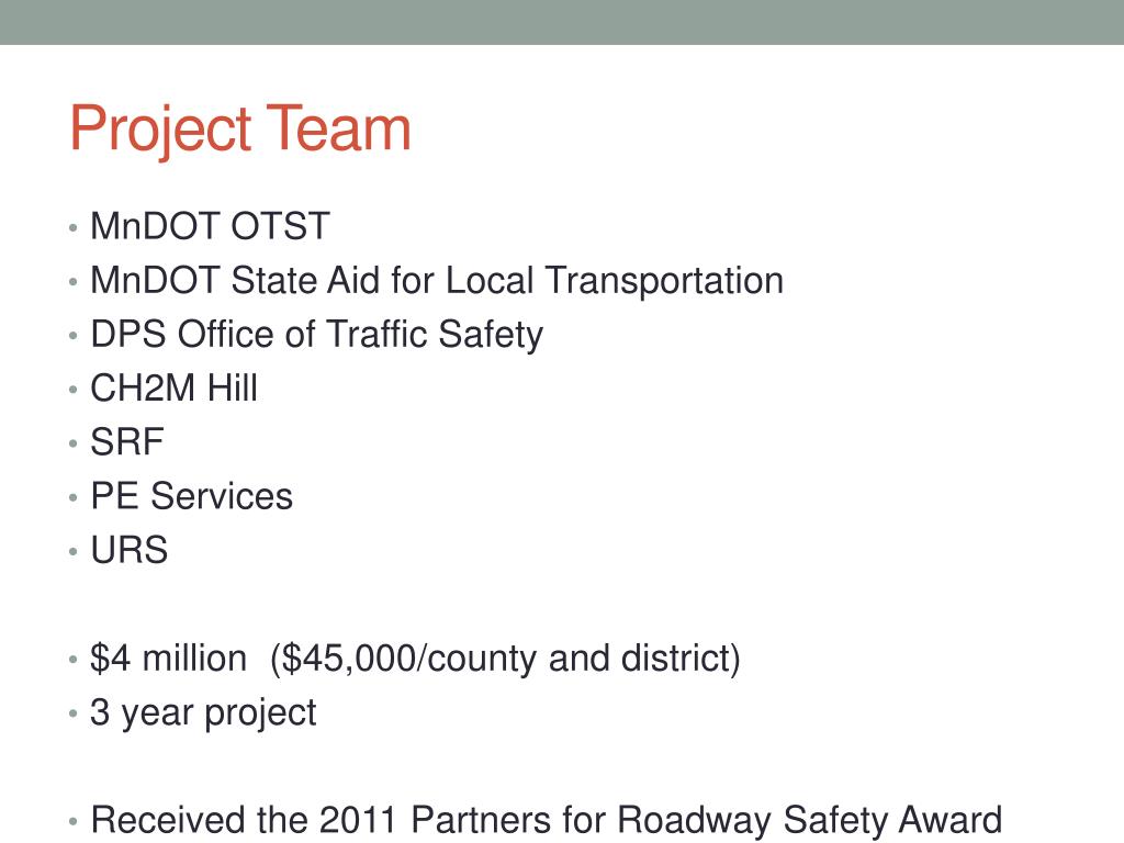 Project Team • MnDOT OTST • MnDOT State Aid for Local Transportation • DPS Office of Traffic Safety • CH2M Hill • SRF • PE Services • URS • $4 million ($45,000/county and district) • 3 year project • Received the 2011 Partners for Roadway Safety Award