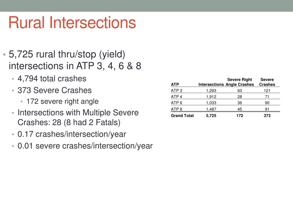 Rural Intersections • 5,725 rural thru/stop (yield) intersections in ATP 3, 4, 6 & 8 • 4,794 total crashes • 373 Severe Crashes • 172 severe right angle • Intersections with Multiple Severe Crashes: 28 (8 had 2 Fatals) • 0.17 crashes/intersection/year • 0.01 severe crashes/intersection/year