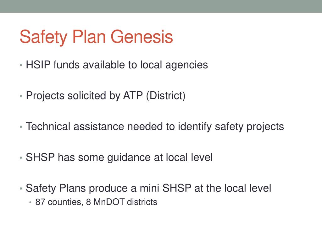 Safety Plan Genesis • HSIP funds available to local agencies • Projects solicited by ATP (District) • Technical assistance needed to identify safety projects • SHSP has some guidance at local level • Safety Plans produce a mini SHSP at the local level • 87 counties, 8 MnDOT districts