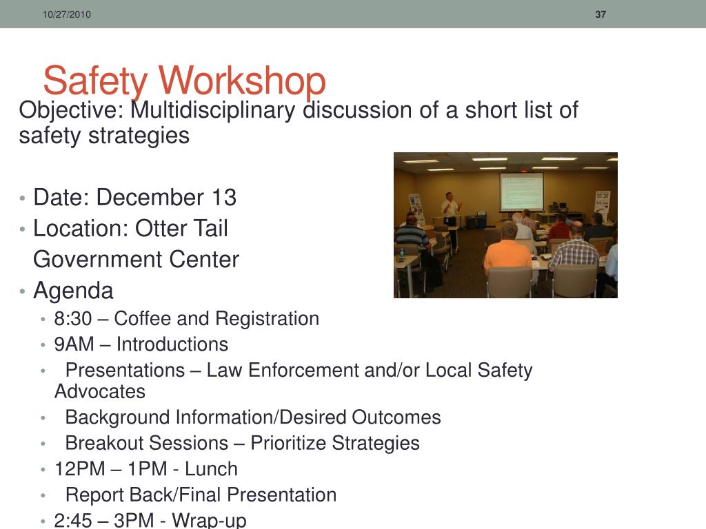 Safety Workshop Objective: Multidisciplinary discussion of a short list of safety strategies • Date: December 13 • Location: Otter Tail Government Center • Agenda • 8:30 – Coffee and Registration • 9AM – Introductions • Presentations – Law Enforcement and/or Local Safety Advocates • Background Information/Desired Outcomes • Breakout Sessions – Prioritize Strategies • 12PM – 1PM - Lunch • Report Back/Final Presentation • 2:45 – 3PM - Wrap-up