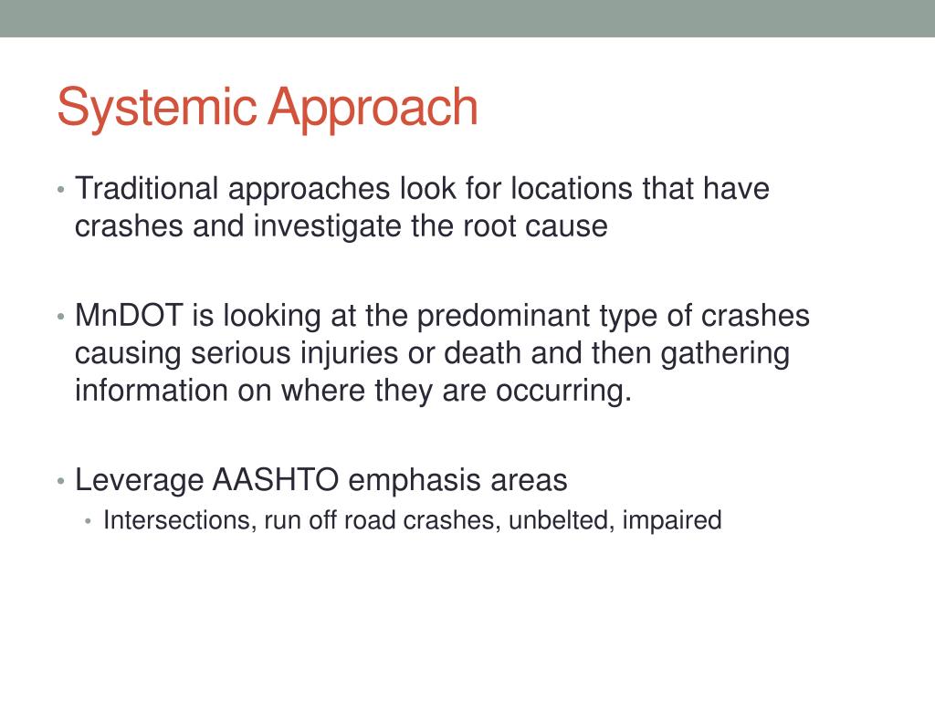 Systemic Approach • Traditional approaches look for locations that have crashes and investigate the root cause • MnDOT is looking at the predominant type of crashes causing serious injuries or death and then gathering information on where they are occurring. • Leverage AASHTO emphasis areas • Intersections, run off road crashes, unbelted, impaired