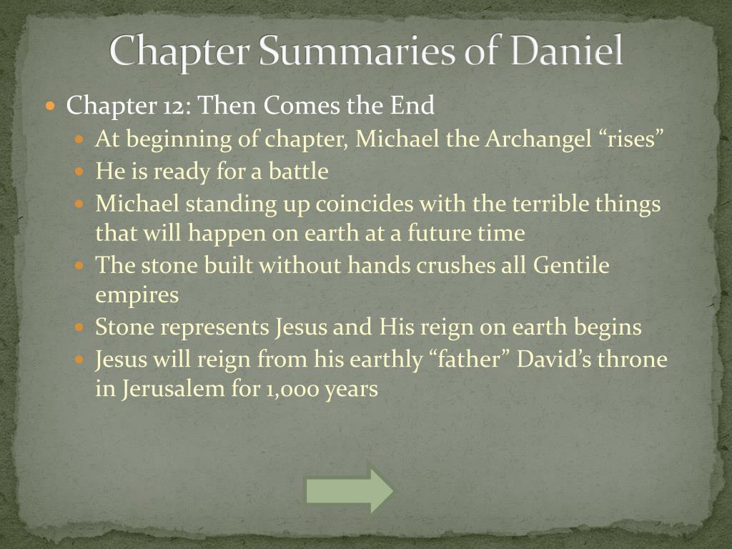Chapter Summaries of Daniel • Chapter 12: Then Comes the End • At beginning of chapter, Michael the Archangel “rises” • He is ready for a battle • Michael standing up coincides with the terrible things that will happen on earth at a future time • The stone built without hands crushes all Gentile empires • Stone represents Jesus and His reign on earth begins • Jesus will reign from his earthly “father” David’s throne in Jerusalem for 1,000 years