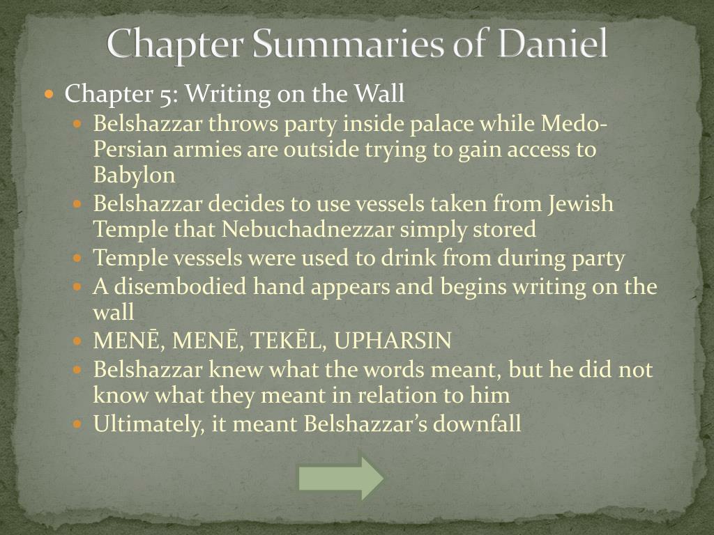 Chapter Summaries of Daniel • Chapter 5: Writing on the Wall • Belshazzar throws party inside palace while Medo-Persian armies are outside trying to gain access to Babylon • Belshazzar decides to use vessels taken from Jewish Temple that Nebuchadnezzar simply stored • Temple vessels were used to drink from during party • A disembodied hand appears and begins writing on the wall • MENĒ, MENĒ, TEKĒL, UPHARSIN • Belshazzar knew what the words meant, but he did not know what they meant in relation to him • Ultimately, it meant Belshazzar’s downfall