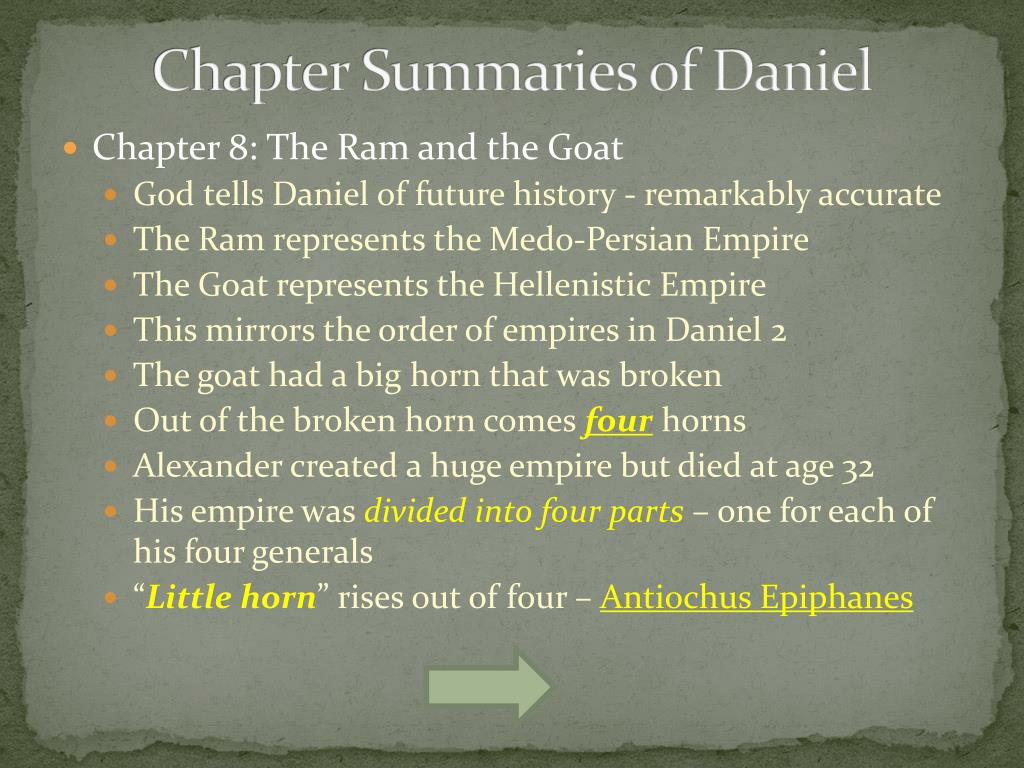 Chapter Summaries of Daniel • Chapter 8: The Ram and the Goat • God tells Daniel of future history - remarkably accurate • The Ram represents the Medo-Persian Empire • The Goat represents the Hellenistic Empire • This mirrors the order of empires in Daniel 2 • The goat had a big horn that was broken • Out of the broken horn comes four horns • Alexander created a huge empire but died at age 32 • His empire was divided into four parts – one for each of his four generals • “Little horn” rises out of four – Antiochus Epiphanes