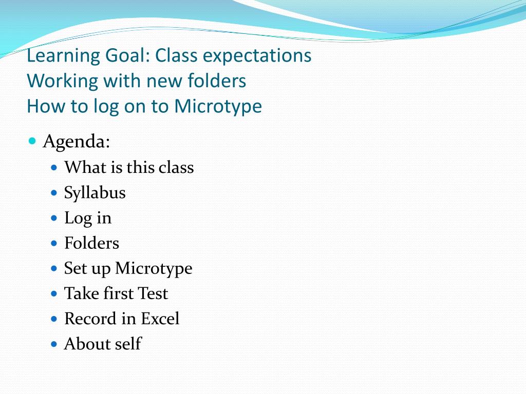 Learning Goal: Class expectations Working with new folders How to log on to Microtype. Agenda: What is this class Syllabus Log in Folders Set up Microtype Take first Test Record in Excel About self. Please tell me about yourself .