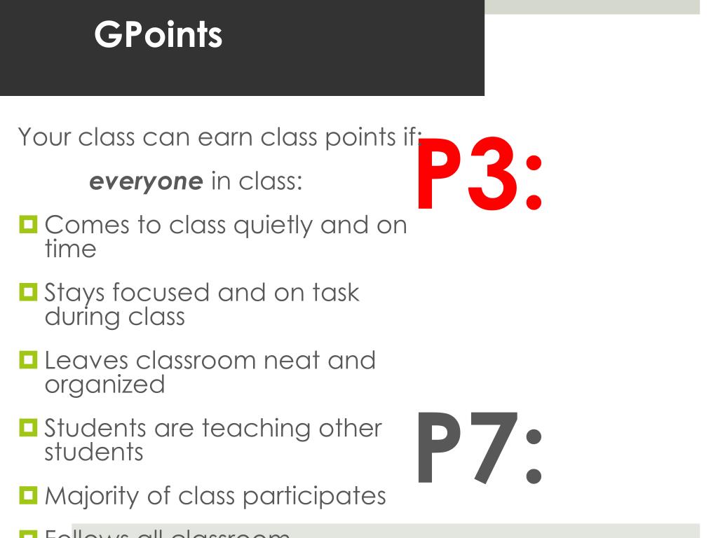 GPoints Your class can earn class points if: everyonein class: Comes to class quietly and on time Stays focused and on task during class Leaves classroom neat and organized Students are teaching other students Majority of class participates Follows all classroom expectations and procedures And more… P3: P7: