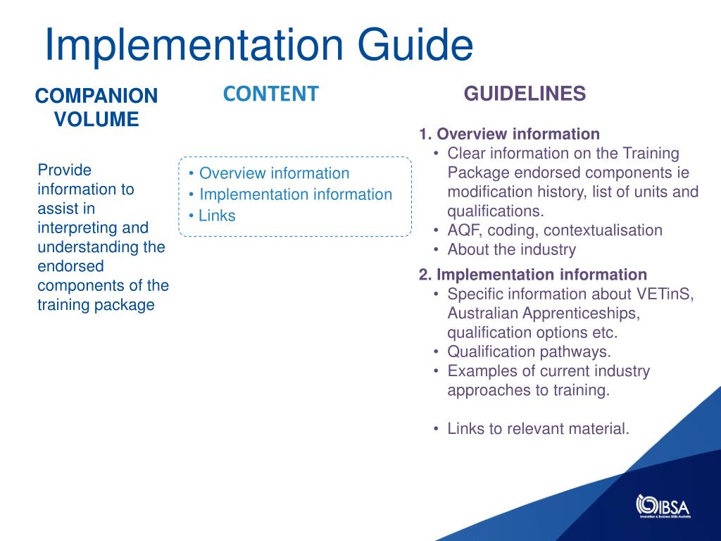 Implementation Guide CONTENT GUIDELINES COMPANION VOLUME • 1. Overview information • Clear information on the Training Package endorsed components ie modification history, list of units and qualifications. • AQF, coding, contextualisation • About the industry • 2. Implementation information • Specific information about VETinS, Australian Apprenticeships, qualification options etc. • Qualification pathways. • Examples of current industry approaches to training. • Links to relevant material. Provide information to assist in interpreting and understanding the endorsed components of the training package • Overview information • Implementation information • Links