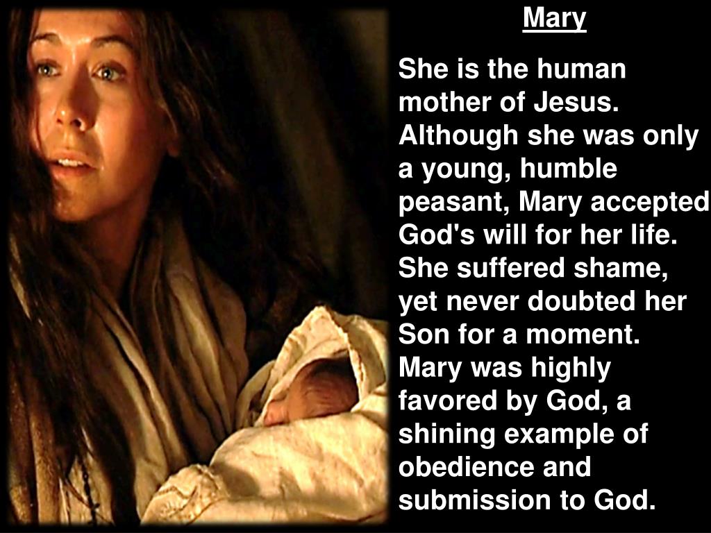 Mary She is the human mother of Jesus. Although she was only a young, humble peasant, Mary accepted God's will for her life. She suffered shame, yet never doubted her Son for a moment. Mary was highly favored by God, a shining example of obedience and submission to God.