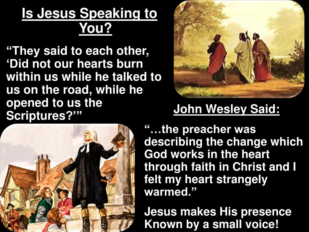 Is Jesus Speaking to You? “They said to each other, ‘Did not our hearts burn within us while he talked to us on the road, while he opened to us the Scriptures?’” John Wesley Said: “…the preacher was describing the change which God works in the heart through faith in Christ and I felt my heart strangely warmed.” Jesus makes His presence Known by a small voice!