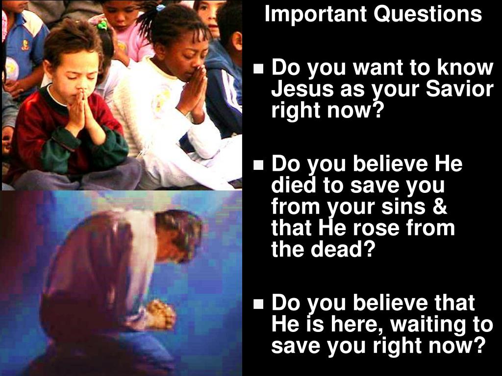 Important Questions Do you want to know Jesus as your Savior right now? Do you believe He died to save you from your sins & that He rose from the dead? Do you believe that He is here, waiting to save you right now?
