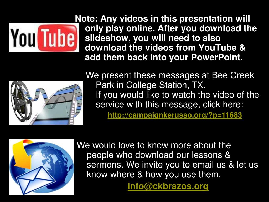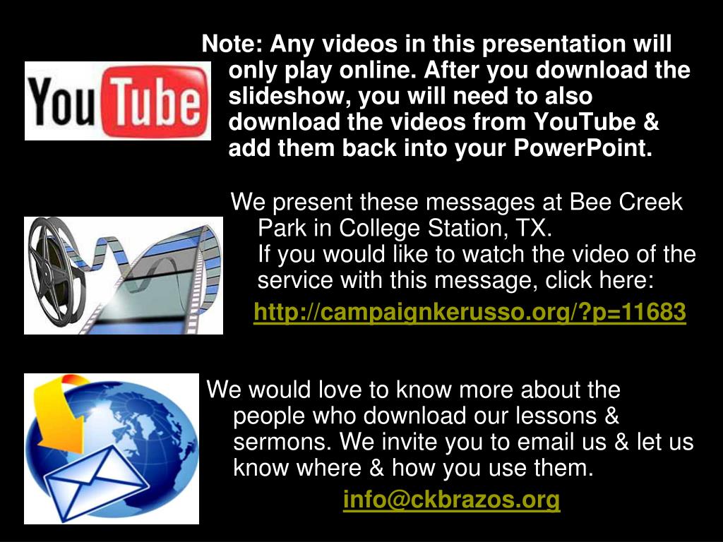 We present these messages at Bee Creek Park in College Station, TX. If you would like to watch the video of the service with this message, click here: http://campaignkerusso.org/?p=11683 We would love to know more about the people who download our lessons & sermons. We invite you to email us & let us know where & how you use them. info@ckbrazos.org Note: Any videos in this presentation will only play online. After you download the slideshow, you will need to also download the videos from YouTube & add them back into your PowerPoint.