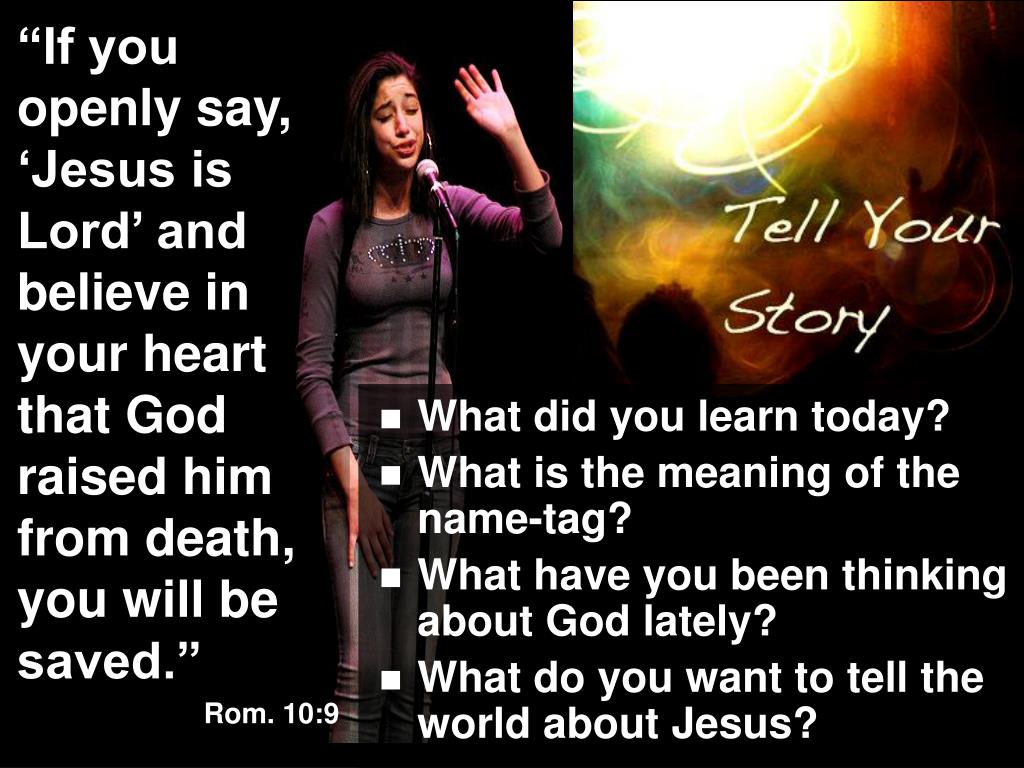 “If you openly say, ‘Jesus is Lord’ and believe in your heart that God raised him from death, you will be saved.” Rom. 10:9 What did you learn today? What is the meaning of the name-tag? What have you been thinking about God lately? What do you want to tell the world about Jesus?