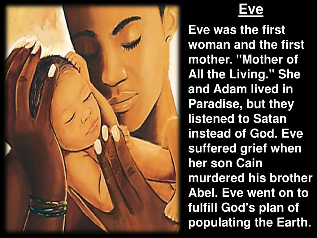 Eve Eve was the first woman and the first mother. "Mother of All the Living." She and Adam lived in Paradise, but they listened to Satan instead of God. Eve suffered grief when her son Cain murdered his brother Abel. Eve went on to fulfill God's plan of populating the Earth.