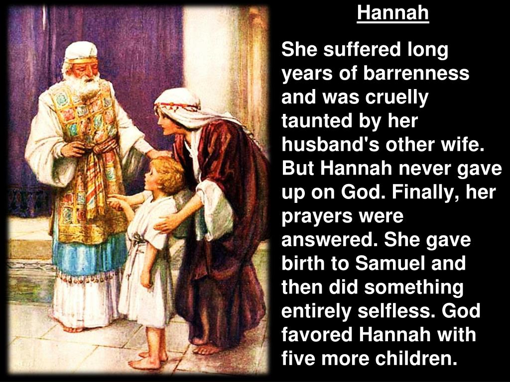 Hannah She suffered long years of barrenness and was cruelly taunted by her husband's other wife. But Hannah never gave up on God. Finally, her prayers were answered. She gave birth to Samuel and then did something entirely selfless. God favored Hannah with five more children.