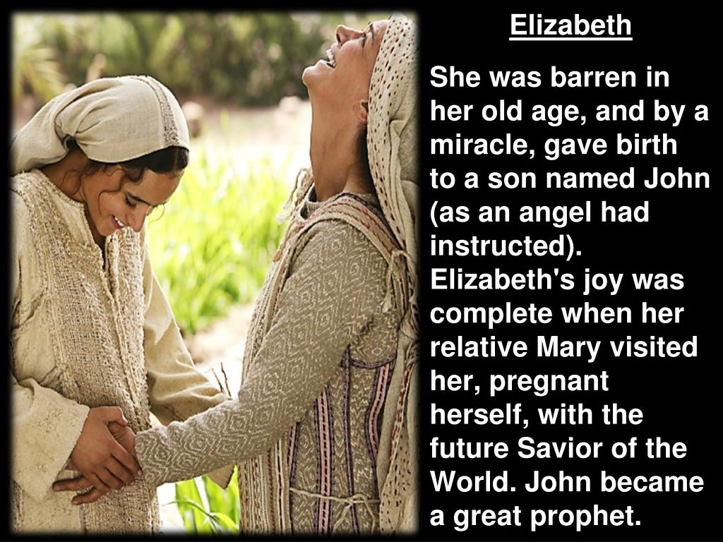 Elizabeth She was barren in her old age, and by a miracle, gave birth to a son named John (as an angel had instructed). Elizabeth's joy was complete when her relative Mary visited her, pregnant herself, with the future Savior of the World. John became a great prophet.